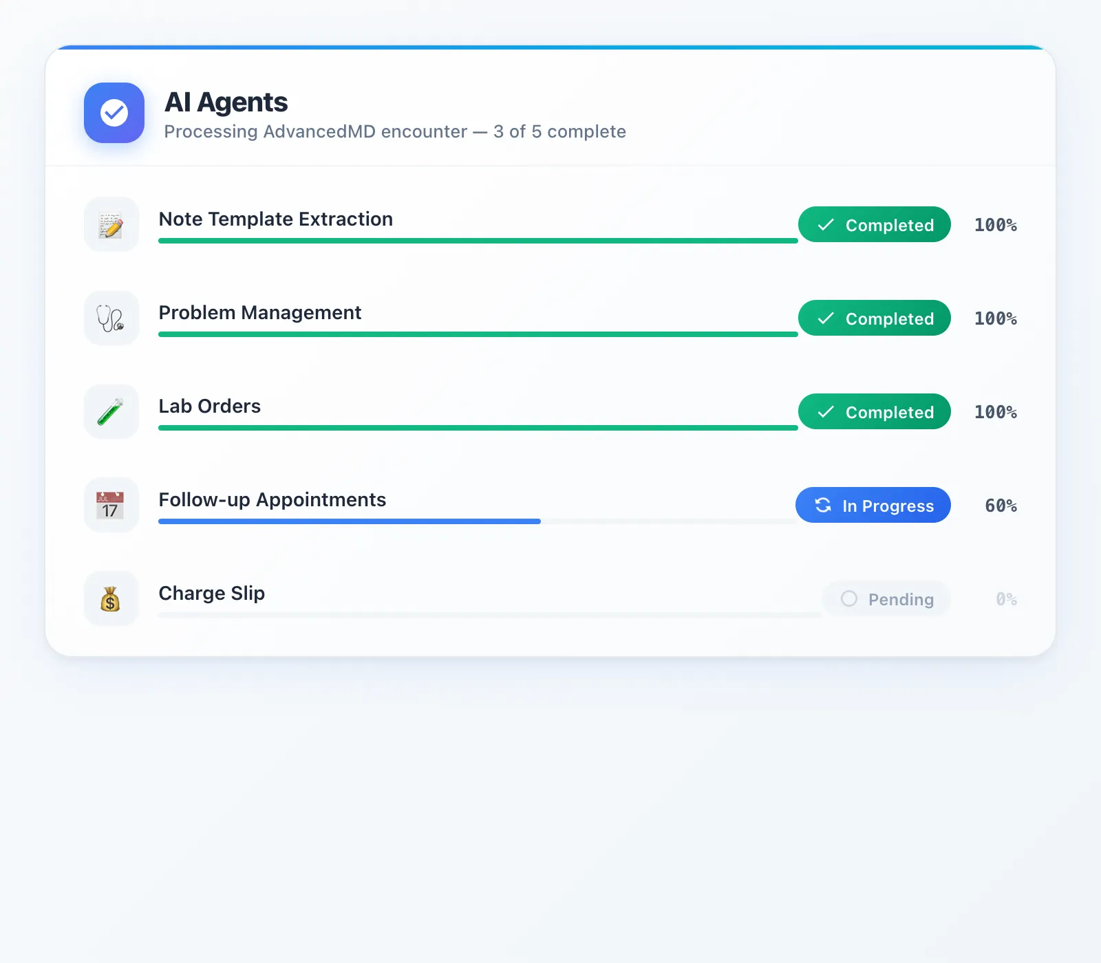 See all 5 AI agents working inside an AdvancedMD encounter — from template extraction through charge slip automation — in under 7 minutes.
