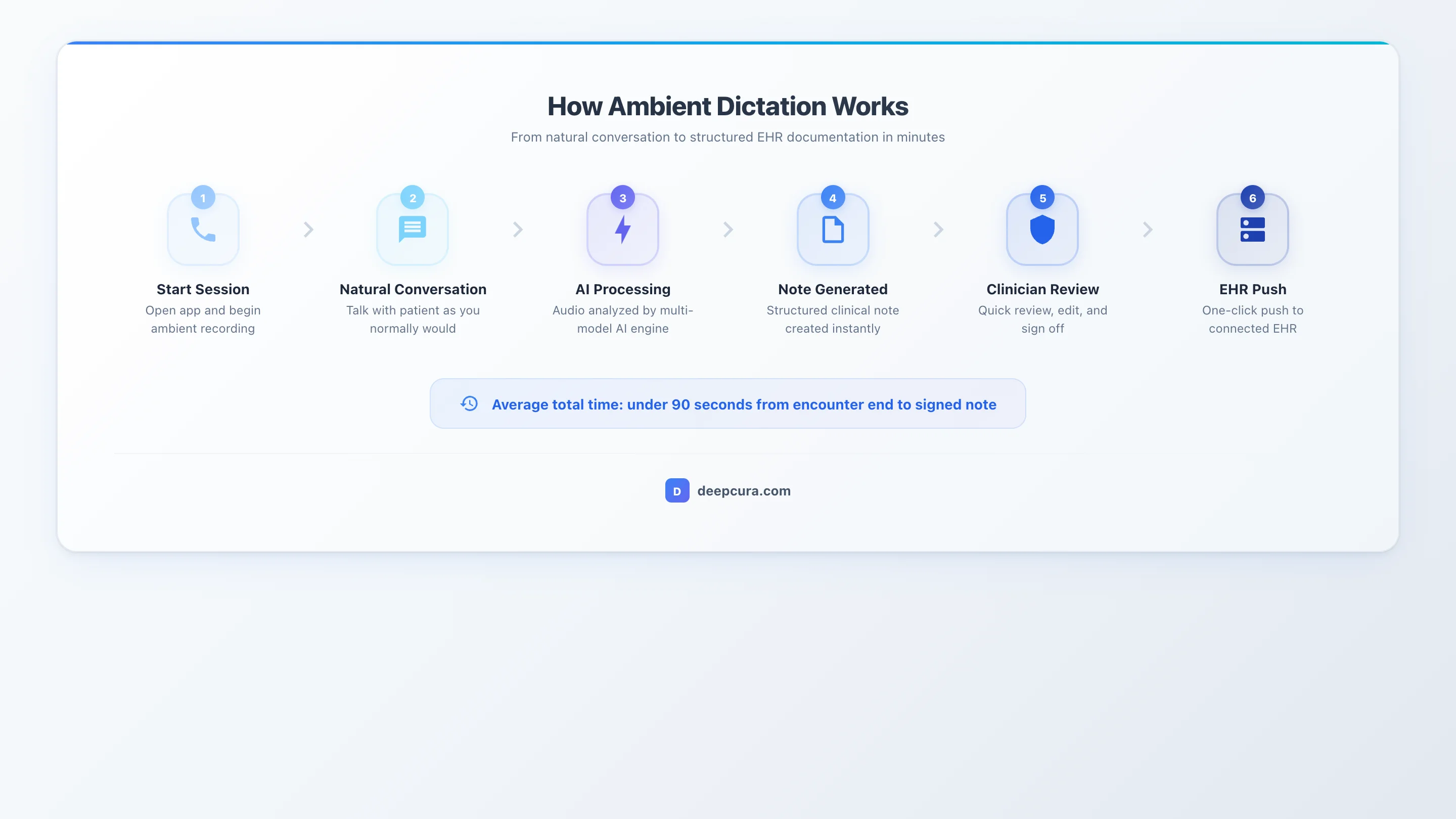 Understanding the technical workflow helps clinicians evaluate tools and set realistic expectations for accuracy and turnaround time. Here is how ambient dictation works from encounter start to EHR integration.