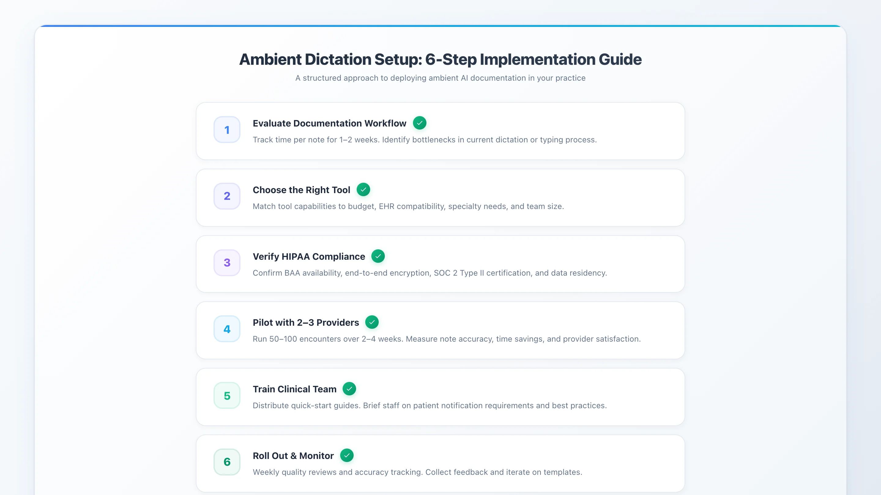 Infographic: 6-step implementation checklist for setting up ambient dictation in your practice.