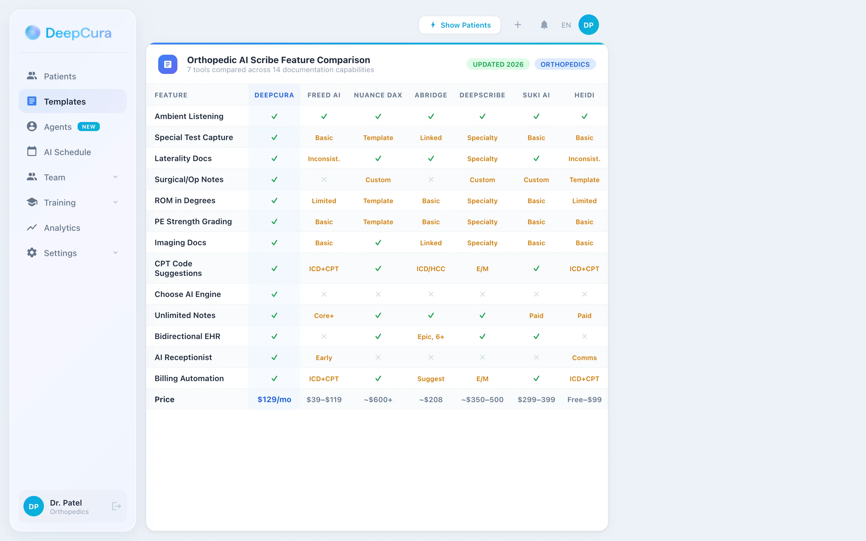 Verdict: DeepCura is the strongest overall choice for orthopedic surgeons who want both specialized documentation quality and a full-platform solution that handles everything from patient calls to EHR write-back. The $129 price point includes capabilities that would cost $800+ if purchased separately from point solutions.