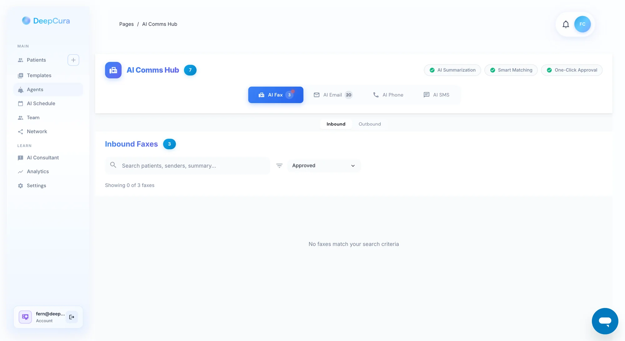 Screenshot: DeepCura UI — inbound fax management with AI-summarized faxes and automated processing.