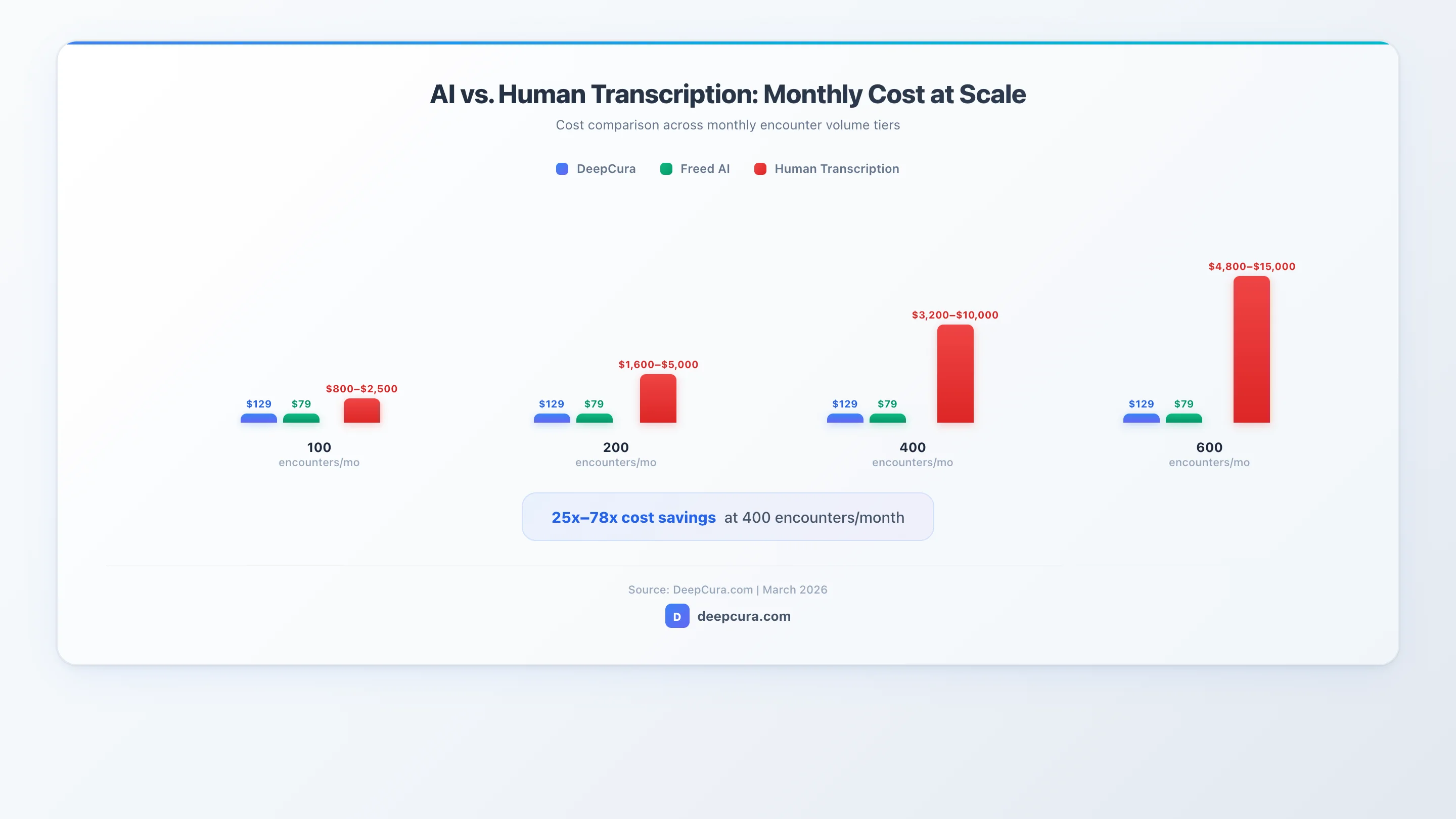 The economics are not subtle. At 400 encounters per month — roughly 20 encounters per working day, a typical volume for a busy primary care or family medicine practice — DeepCura costs $129 total versus $3,200-$10,000 for human transcription. That is a 25x-78x cost difference. Even at the lowest volume (100 encounters/month), AI transcription saves $671-$2,371 per month compared to human alternatives.
