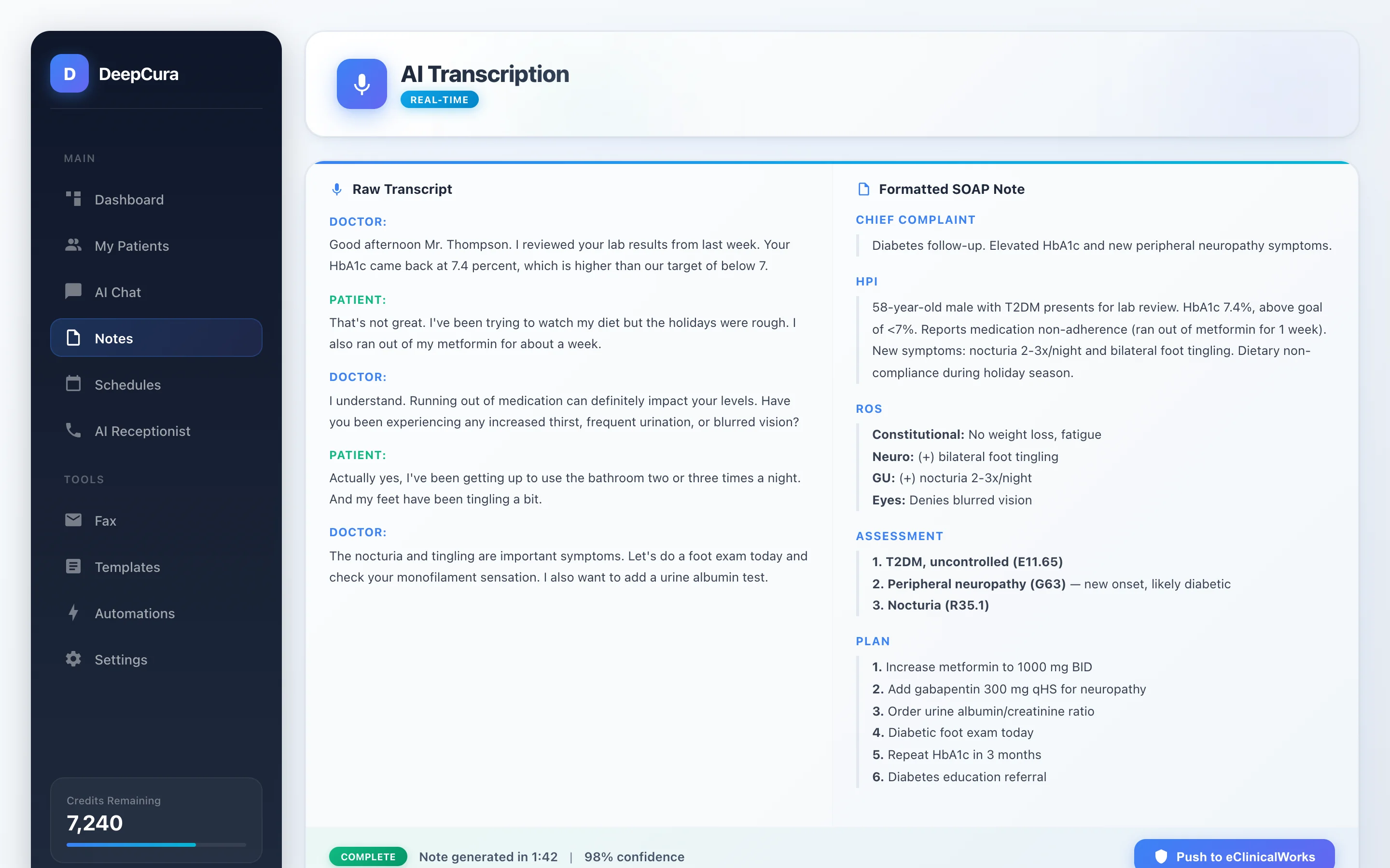 Screenshot: DeepCura AI scribe — real-time transcription with structured SOAP note output.